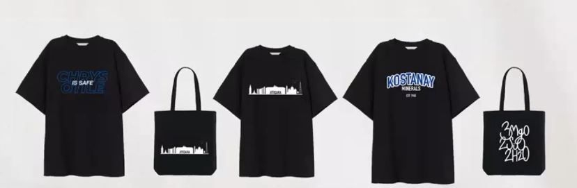 •Футболка с логотипом нашего города.  Тут дизайн отражает ключевые достопримечательности Житикары со зданием АО «КМ» в центре.