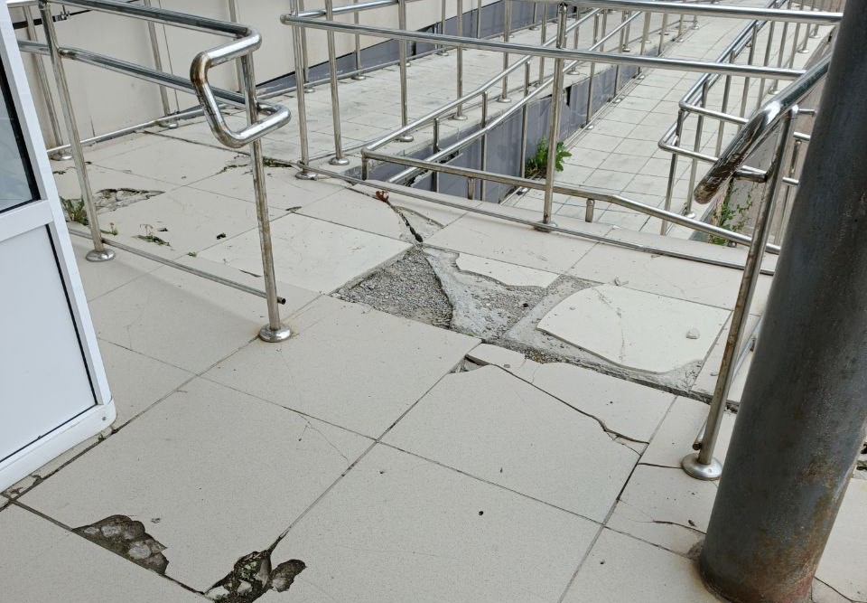 Смысл в том, что, как рассказала нам молодая мама, крыльцо педиатрических участков находится в неприглядном виде. Повреждения плитки есть не только на ступенях и придверной площадке, но и на протяжении всего пандуса.