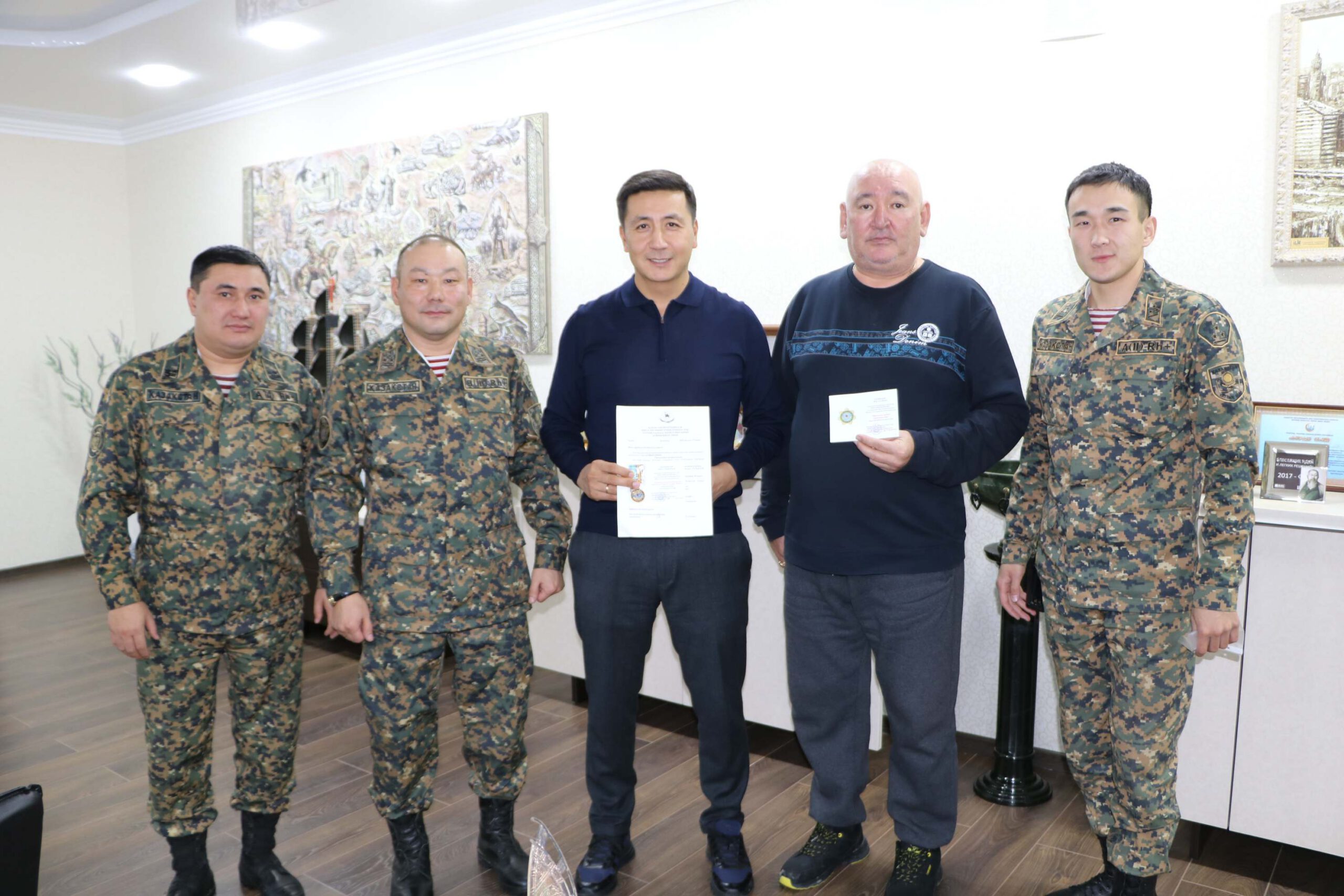 Кроме того, за тесное сотрудничество и воспитание подрастающего поколения нагрудный знак национальной армии РК получил руководитель отдела культура и спорта АО «КМ» Жангельды Алтаевич Тулубаев.